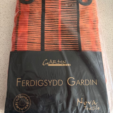 Gardinerne er aldri brukt, men en er pakket ut. De er med sorte maljer.