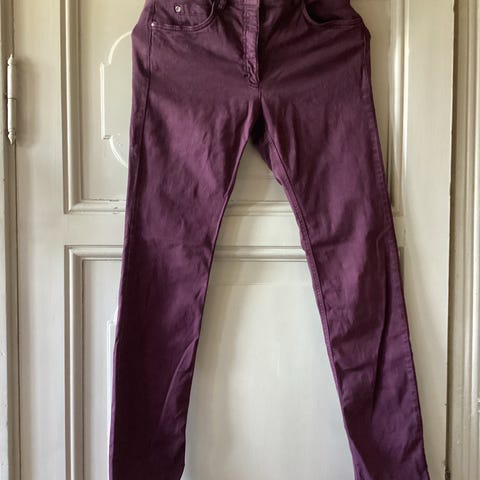 Lite brukt, helt fin mørkeblå jeans.Sort mønster med litt glitter i stoffet.Livvidde ca 83 cm/ lengde fra linning og ned ca 100 cm. Har litt smale ben.