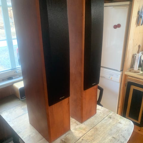 Pent brukt Proson søyle høytalere med to foran med en senter høytaler og to bak . Max power 100watt låter bra på gutterommet, høyde 103 pr søylehøytaler .