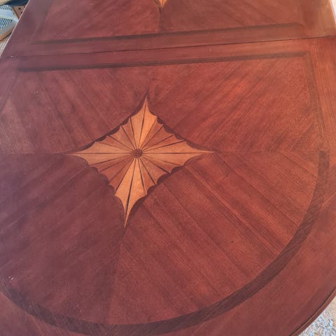 Generelt god stand, men det er noen merker og slitasje i lakken på bordplaten (se bilder). Bordet kan med fordel pusses lett og oljes/lakkeres om man ønsker et strøkent uttrykk. Ingen løse deler eller strukturelle skader.