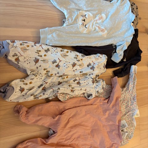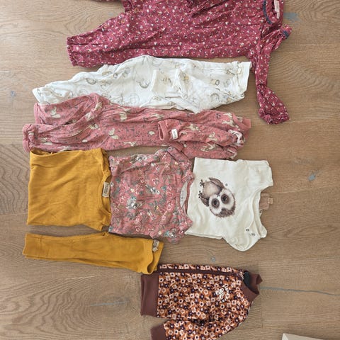 Klespakke med to bukser, seks bodyer, en pysj tre kjoler. Pent brukt. Selges fra et røykfritt og dyrefritt hjem. Kun vasket med parfymefri såpe.
