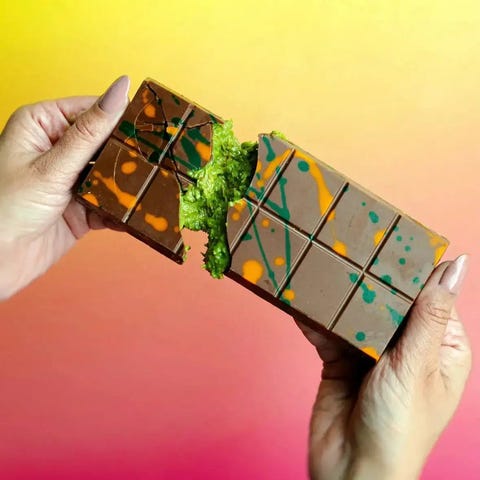- Crispy knafeh mixed either pistachios and tahini paste, encased in milk chocolate