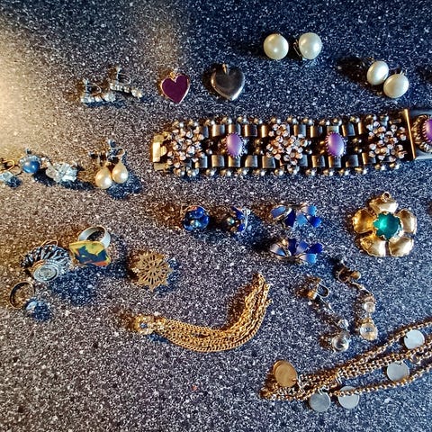 - Øreringer i sølv, gull, blå og svart farge: 15 kr pr stk. eller 35 kr samlet.