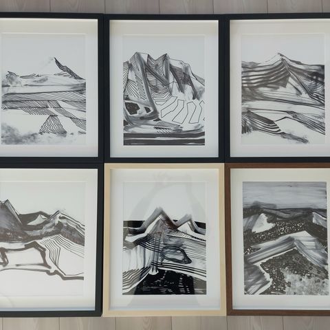 Flotte, pigmenterte farger i sort og orange som gløder i lyset. Glassplate.