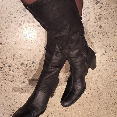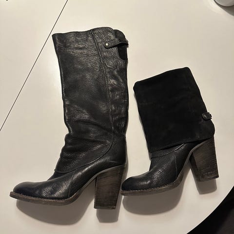Ikke synlig bruksslitasje, som nye. Disse er fantastiske på foten og rålekre. Skaft har stretch og måler ca 42 cm i omkrets men kan strekkes til 45 cm. Hæler er 8 cm, men minus såle er de reelt 6,5 cm. Sålen er rågummi, og derfor ikke glatte på vinterføre.