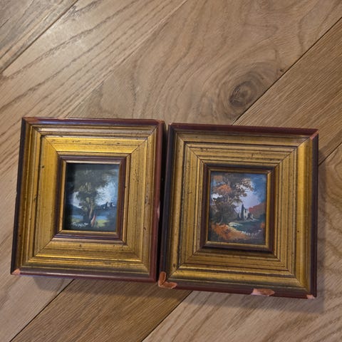 E. Eriksen, olje på plate, landskap, skog, tykk palettkniv, treramme