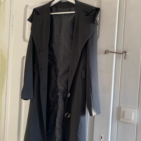 Sitter utrolig fint. Den har ikke belte så den gir ikke former, men gir likevel feminint preg da den er delvis formsydd og har skarpe skuldre og splitt i bakenden.