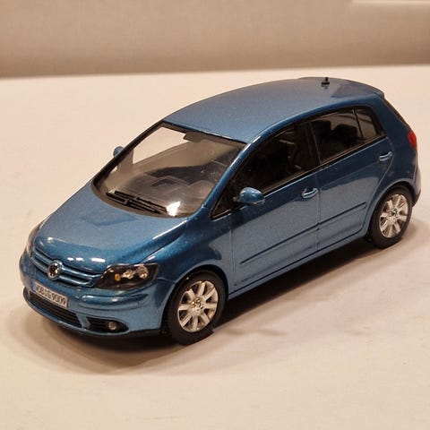 Det var ikke like kult som det hørtes ut. Golf Cross, som egentlig var en Golf Plus med hjulbuelister og litt deksler på fangerne. Modellen er pent behandlet uten synlige skader annet enn at klistremerke med registreringsnummer har falt av foran og løsnet bak . Eske, monter og plate finnes dessverre ikke lenger.