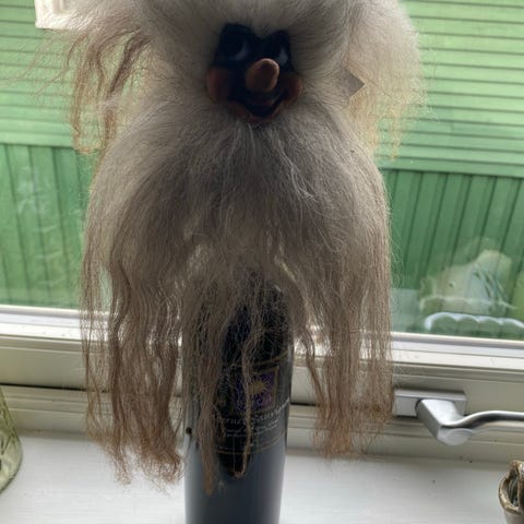 Troll med Instrumenter, 15 cm høye. Norsk flagg bak.
