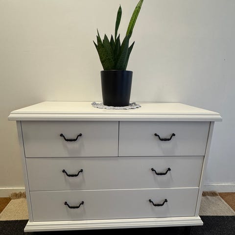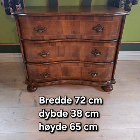 Gammel heltre kommode i god stand . Malt av proff maler i Jotun varm grå (på oppdrag). Ukjent alder. Pene detaljer. Mangler nøkkel. Trenger litt stearin (er det som jeg fikk tips om ) for å skli litt bedre ved uttak av skuffene.