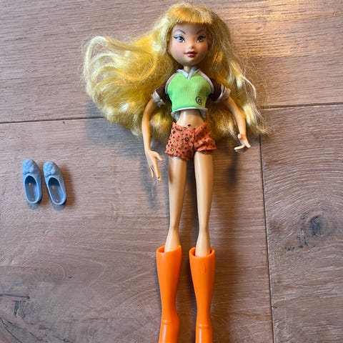 Barbie dukke iført en rosa kjole. Dukken har blondt hår og er designet for lek og samling. Kjolen har detaljer som en sløyfe og glitrende elementer, ideell for barn som liker mote og rollelek. den er merket Mattel sko og hårspenne dølger med