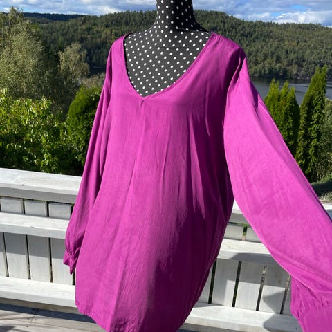 Zizzi bluse i lilla farge, størrelse 54/56, fra Ellos. Blusen har et delikat design med detaljerte utskjæringer øverst, som gir et elegant uttrykk. Materialet er lett og behagelig, egnet for hverdagsbruk eller spesielle anledninger.