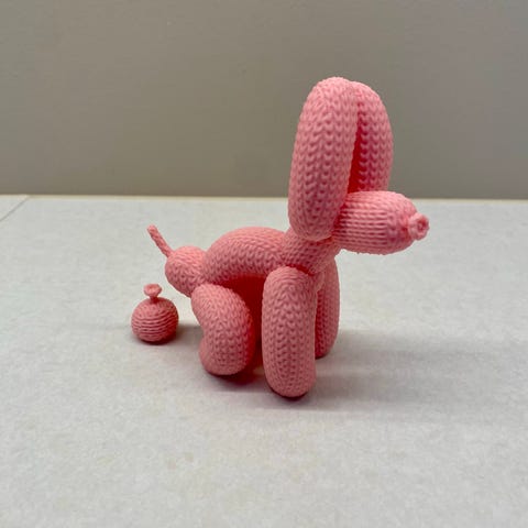 Ms. Bubble ballonghund er en fargerik, 3D-printet figur inspirert av den klassiske ballonghunden – hånddekorert med decopudder og akrylmaling.