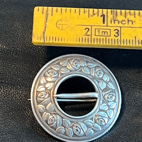 Brosjen er i Biedermeier stil og fra rundt 1930-1870. Tror hovedmaterialet er messing, men er ikke sikker, kan også være forgylt sølv, men ser ingen sølv merker noe sted, så selges som messing brosje.