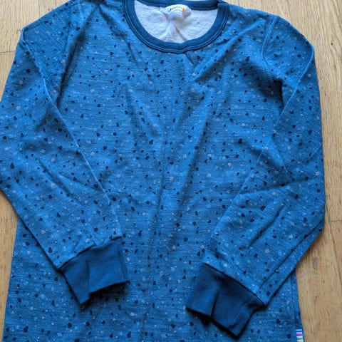 4. Reflex blå Merinoull/bambus ulltøy overdel med mønster 110/116 (brukt 2 sesonger. Ingen hull, liten flekk) Ny pris 349,-