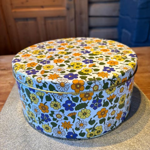 Kakeboks med motiv av en hund sommerfugler blomster blå