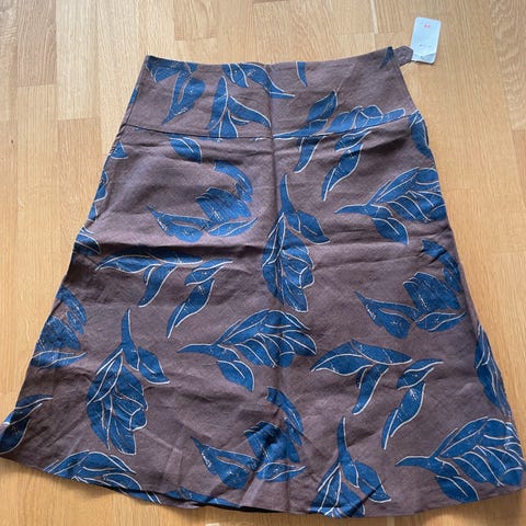 Veldig fint 100% linskjørt fra HM - ikke brukt. Str 34. Litt gullskimmer i stoffet. Lommer på sidene. Glidelås. Går til midt på låret.