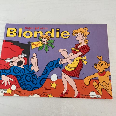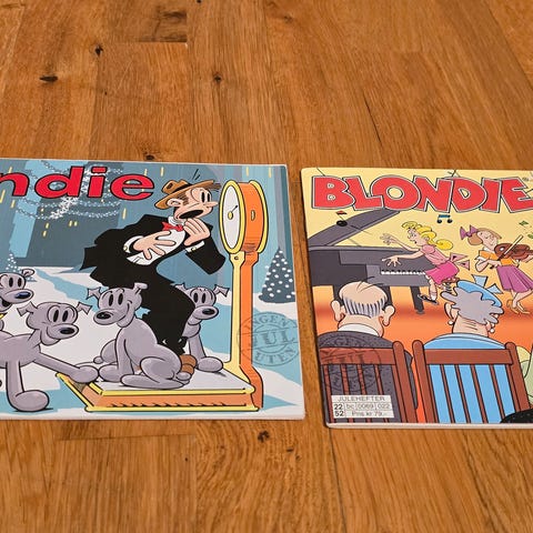 Selges 11 julehefter 3 blader og 2 pocket av Blondie tegneserien. Kan hentes i Oslo, på Tjøme eller sendes. Pris 125