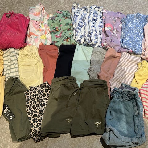 Klespakke med 8 skjørt & 2 topper + 7 shorts. Str 134 og 140. Selges samlet. Brukte klær, mye bruk igjen.