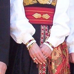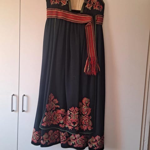 Beltestakk, skjorter, sjal, hodebånd og bunadsølv selges samlet.