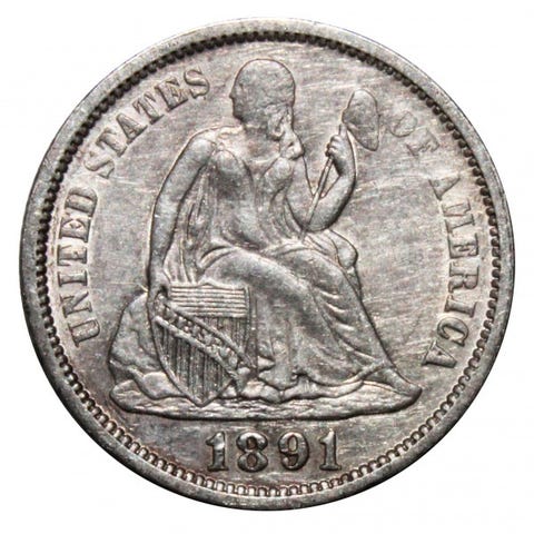 1891 Liberty Seated Dime Sølvmynt. Denne amerikanske mynten fra 1891 er en del av Liberty Seated-serien og er laget av sølv. Myntens forside viser en sittende frihetsfigur, mens baksiden har påskriften 'ONE DIME' omgitt av en krans. Egnet for samlere av historiske amerikanske mynter.