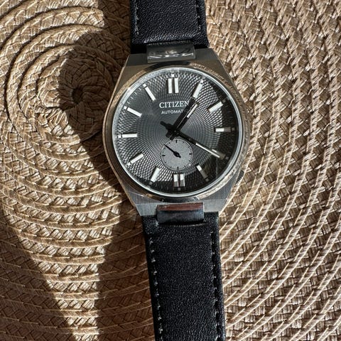 Klokka er nesten ikke brukt. Den har ripefritt safirglass og er i titan. Noen ekstra ledd medfølger. Kan hentes i Son.