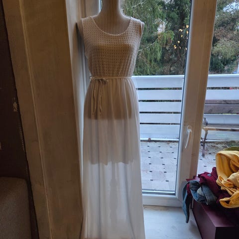 Sort kjole med lange ermer og strikk ved håndleddet på ermene. Deler av kjolen, ermene og sidene er sort lett gjennomsiktig med hvite prikker. Kjolen er knelang.