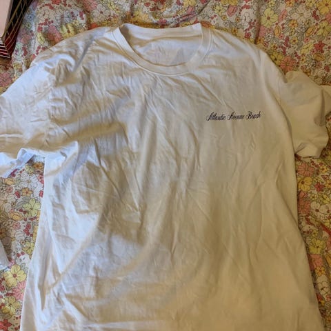 Hvit T-skjorte med grå sandfarget/grå/hvit tekst. Stoffet er luftig og mykt.