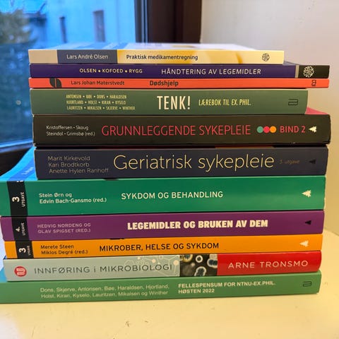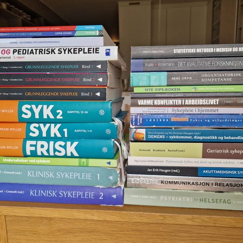 Selger bøker innenfor helse og sosialfag, sykepleie, juss mm for 50kr pr stk.