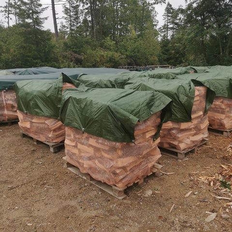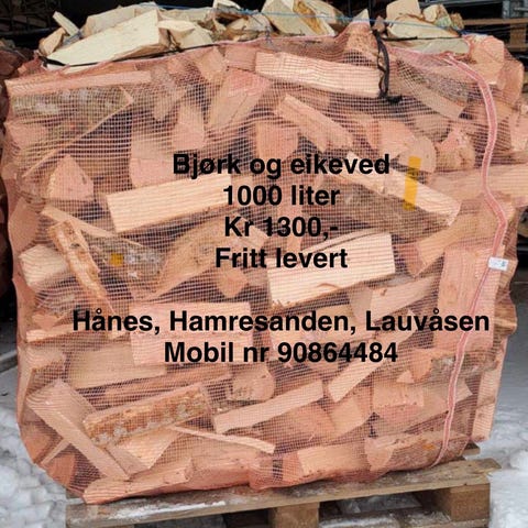 Har noen 1000 liters sekker med furu ved igjen fra ifjor. Disse har vært lagret inne, og er helt tørre. Kappet i 30 cm lengde.