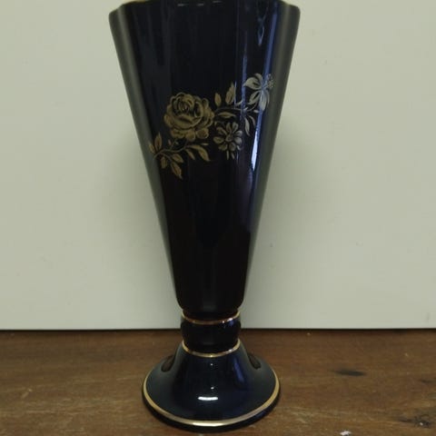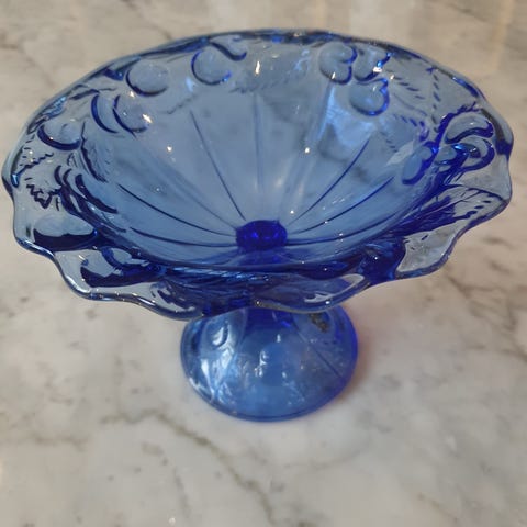 Søt liten skål på stett, laget med mangan. Lilla/rosa farget glass.