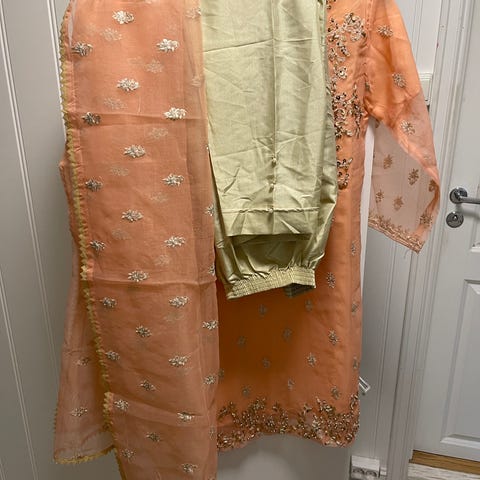 Veldig fint fancy dupatta med rosa kant. Passer til ulike anledninger og kan kombineres med forskjellige antrekk. Pent brukt