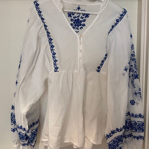 Topp i bomull fra Zara med broderi i blåfarge. Kan hentes i Tønsberg eller sendes. Se gjerne mine andre annonser, mye fine klær 😊