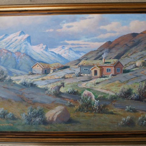 Maleriet har en skade, lite synlig, en rift ca. 2,5cm. Bør være lett reparerbar for kyndig person.