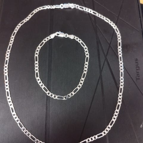 Halskjede 42,5 cm + lenke 6,5 cm. Indikert ny pris 750. Armbånd dia 9 cm, elastisk. Indikert ny pris 450
