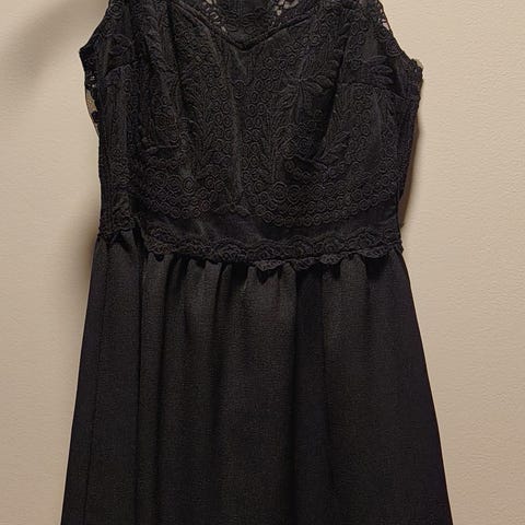 Svart kjole med flotte detaljer. Stroppene går i kryss bak på ryggen.