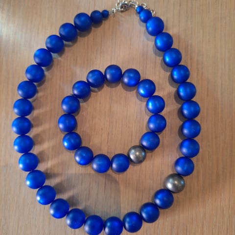 Halskjede 45 cm + lenke 6,5 cm. Ny indikert til ca kr 800. Armbånd dia 9 cm, elastisk. Ny indikert til ca kr 500.