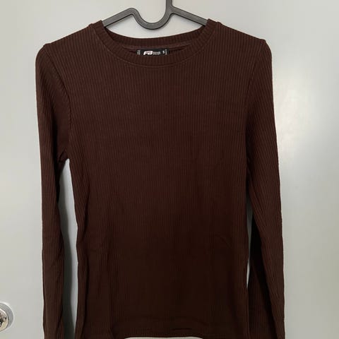 Tynn, brun ribbestrikket genser.