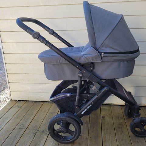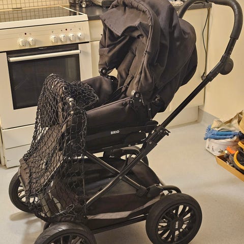 BRIO barnevogn med liggedel i svart tekstil. Vognen har justerbart håndtak og fire hjul, med dreibart forhjul for enklere manøvrering. Liggedelen har hvitt innertrekk og avtagbar kalesje. Det følger med regntrekk som dekker hele vognen. Understellet har varekurv for oppbevaring. Egnet til bruk for spedbarn i liggestilling. BUD ØNSKES