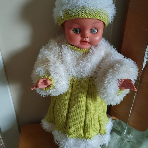 Settet er helt nytt og passer dukker på ca 50 cm. Dukken som har klærene på er ei Nora fra Sandvika dukkefabrikk.