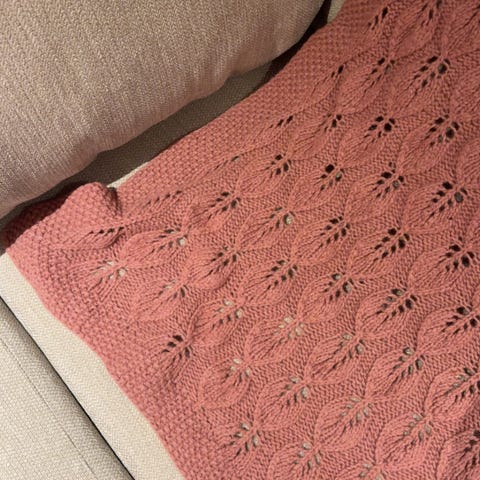 Hjemmestrikket vognteppe i marius-mønster. Omtrent ikke brukt, fremstår veldig pent.