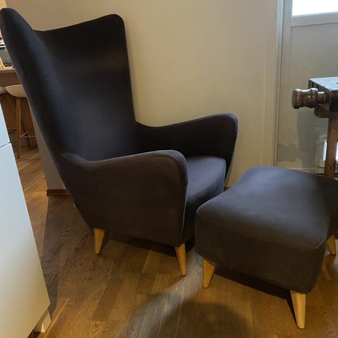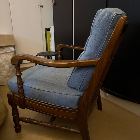 Godt brukt lenestol gis bort. Mekanismen for å skyve stolryggen bakover er litt treg, men virker på et vis. Det skal være mulig å fikse med ei fjær.