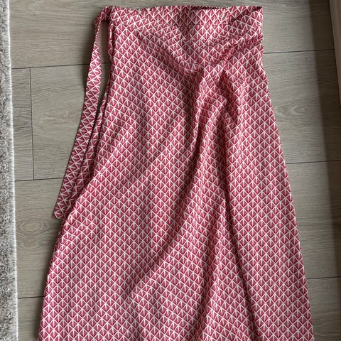 Fint omslagsskjørt i str S. Det har knyting i den ene siden og glidelås bak. Fordi det kan knytes i siden er det fleksibelt på størrelse. Vil tro det passer både str 36 og 38.