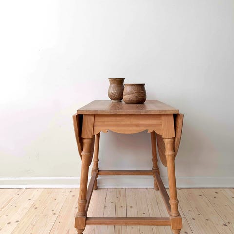 Vakkert, tidløst spisebord i heltre furu med to klaffer. Slipt, vasket lyst og pent. Kraftig og stødig bord med 4 cm tykk bordplate. Praktisk og plassbesparende.