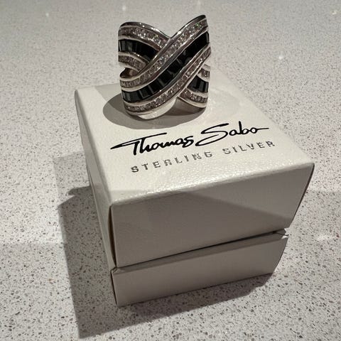 Thomas Sabo armbånd med charm. Elastisk tråd. Vil passe de fleste. De svarte stenene er lavasteiner. Charmen med uglen er utgått sortiment og er stemplet 925 sølv og ordet «Wisdom». Sølv kulen charmen henger i er også 925 sølv. Charmen har noen riper men ikke noe som merkes ved bruk. Selges samlet for 700.