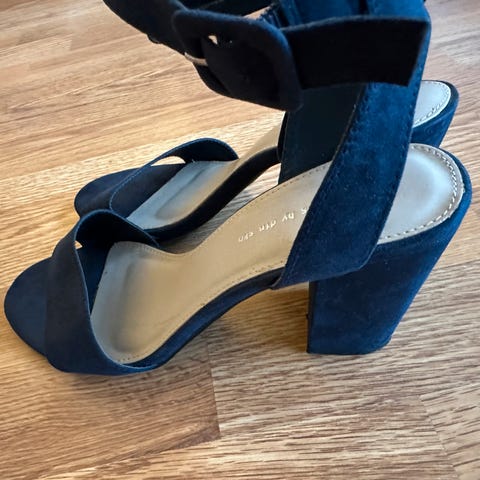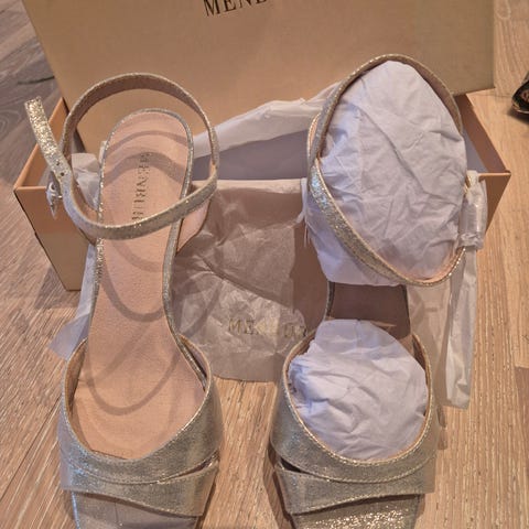 Stilige, elegante og komfortable høyhælte sandaler til dame. Disse skoene er så godt som nye, brukt kun én gang i en innendørs bryllupsfest. De ble kjøpt inn nettopp til denne feiringen.