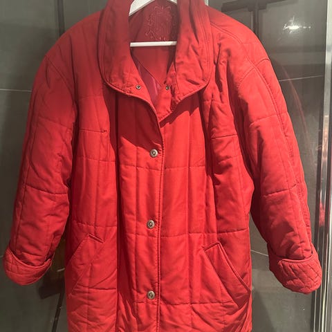 Jakka har en innerlomme, to lommer med glidelås utenpå, glidelås, trykknapper, elastisk nederst på ermene og kan snurpes sammen nederst. Str oversized L for jenter. Fargen ser mest riktig ut på bildene av hele jakken.