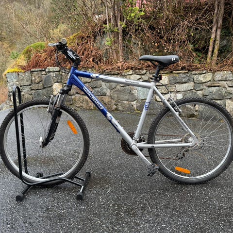 Trek 4300. 16,5 tommer/42cm. 24 gir. Bremseklosser foran og bak. Sykkelen er en eldre modell, men er veldig lite brukt. Har stått lagret innendørs ubrukt i flere år nå. Rammen er fin og uskadet, - noen overfladiske skrammer. Skrammer også på sete og de avtagbare ekstra håndtakene. Dekkene er morkne etter å ha stått lenge, og må byttes. Det er derfor ikke luft i dekkene siden de ikke er tette. Sykkelen trenger service før bruk, særlig i forhold til bremser og gir, da det ikke vites noe om hvordan disse virker. Sykkelen har støtte, bagasje og div reflekser, samt påmontert sykkelcomputer og baklys (de to siste er ikke testet om virker ved et batteribytte).
