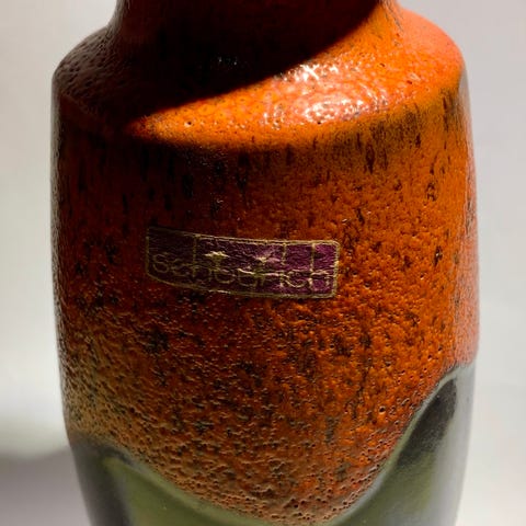 Selv om det ikke står produsentnavn, er denne formen og merkingen mest sannsynlig fra Scheurich – den største og mest kjente produsenten av West Germany-keramikk. Scheurich brukte ofte denne typen preging: modellnummer + høyde, og “W. Germany” i denne karakteristiske skrifttypen og plasseringen.
