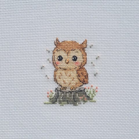 Nytt korsstings broderi på hvit aida 14 ct, montert i en grønn flexiramme med 15 cm Ø.
